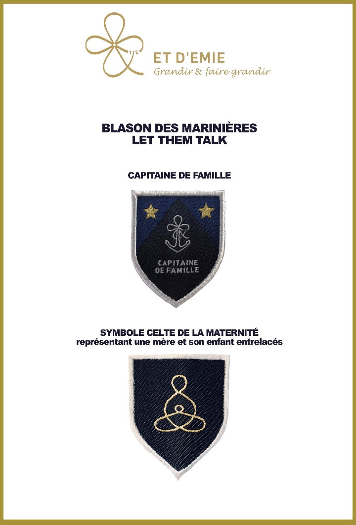 Product details : striped long-sleeved striped shirt, sleeve flap, neckline and hem, vertical LET THEM TALK print on the back between the stripes, FAMILY CONNECTED or CAPITAINE DE FAMILLE crest embroidered in satin stitch on the left arm